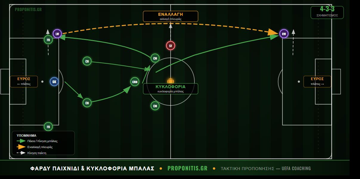 - Κυκλοφορία μπάλας — γρήγορη, σκόπιμη μετακίνηση που αλλάζει το σημείο επίθεσης και βρίσκει τον αδύναμο κρίκο της άμυνας