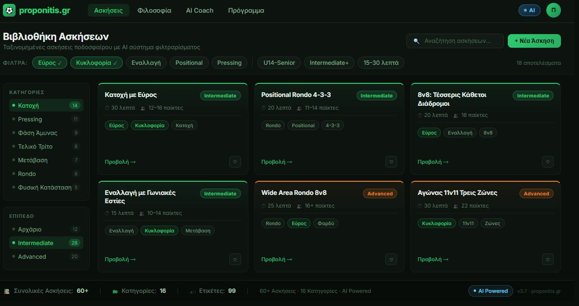 Το proponitis.gr δεν είναι απλώς αρχείο ασκήσεων. Είναι AI πλατφόρμα προπόνησης. Το σύστημα μαθαίνει τι χρησιμοποιείς, ποια επίπεδα προτιμάς, σε ποιες ηλικιακές κατηγορίες δουλεύεις — και σου προτείνει ασκήσεις ευθυγραμμισμένες με το προφίλ σου.