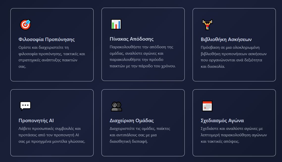 Η λειτουργία Συνομιλίας με ΤΝ είναι η καρδιά του Προπονητή, φέρνοντας κορυφαία προπονητική γνώση στα χέρια σας 24/7. Σε αντίθεση με γενικά chatbot τεχνητής νοημοσύνης, το σύστημά μας είναι ειδικά εκπαιδευμένο και βελτιστοποιημένο για το πλαίσιο της προπόνησης ποδοσφαίρου, κατανοώντας τις αποχρώσεις της μεθοδολογίας προπόνησης, της τακτικής ανάλυσης και της ανάπτυξης παικτών.